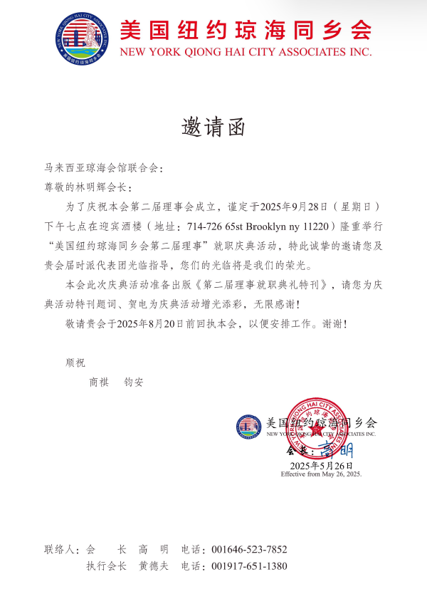 美国纽约琼海同乡会(第二届)新理事宣誓就职庆典活动